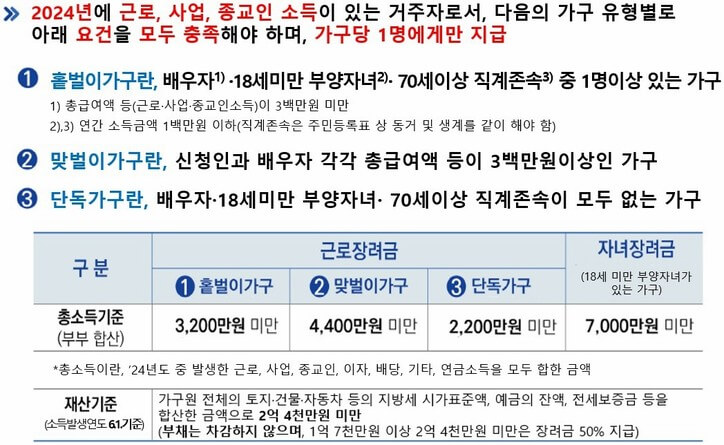 또한 근로자뿐 아니라 사업자·종교인 소득자도 신청할 수 있어 대상 폭이 넓습니다. 2025년부터 맞벌이 가구의 소득 기준이 4,400만 원으로 완화되면서, “작년에는 안 됐는데 올해는 되는 사람”도 충분히 생길 수 있습니다. 즉, 조건만 맞는다면 생각보다 더 많은 가구가 대상에 포함될 수 있는 해예요.