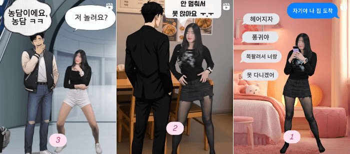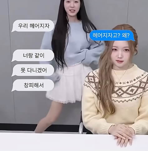 ‘헤어지자’, ‘자기야 나 집 도착했어’ 같은 현실적인 메시지를 영상 자막으로 넣으면서