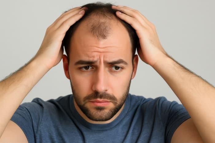 - 남성형 탈모의 전형적인 초기 양상, 이마 양옆이 먼저 빠지는 경향